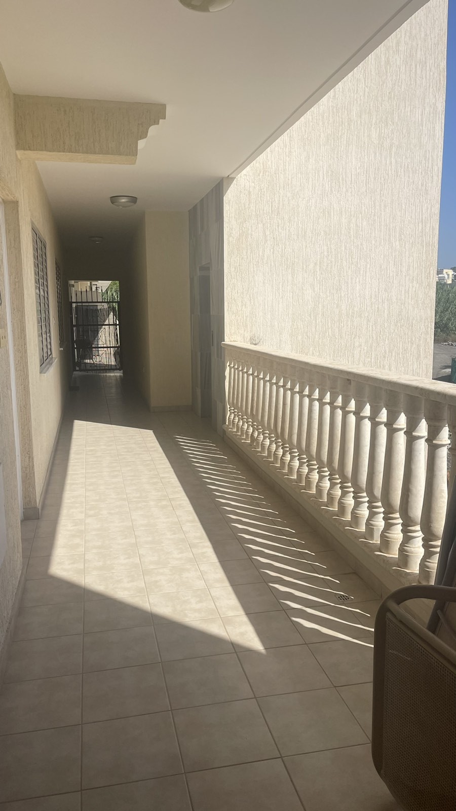 - Covered balcony overlooking green area