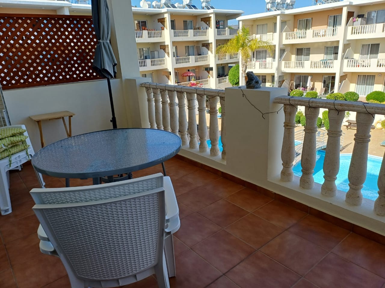 The apartment is within a complex with large residents’ swimming pool and terrace overlooks landscaped gardens and offers a fabulous Mediterranean ambience, ideal for relaxation.