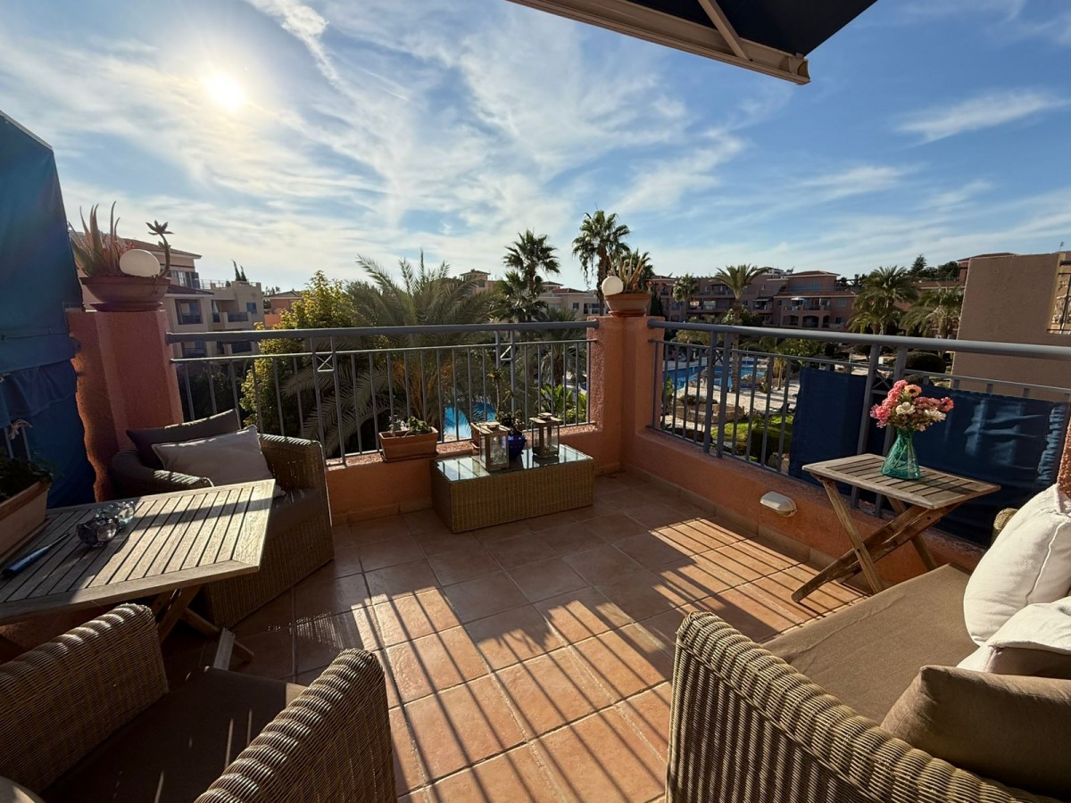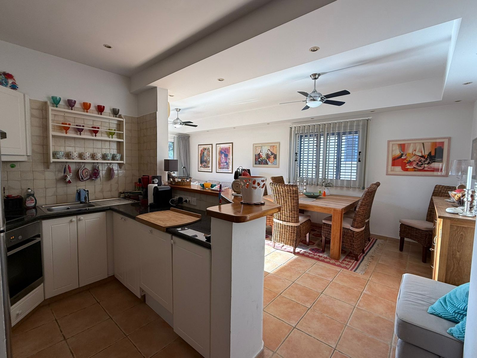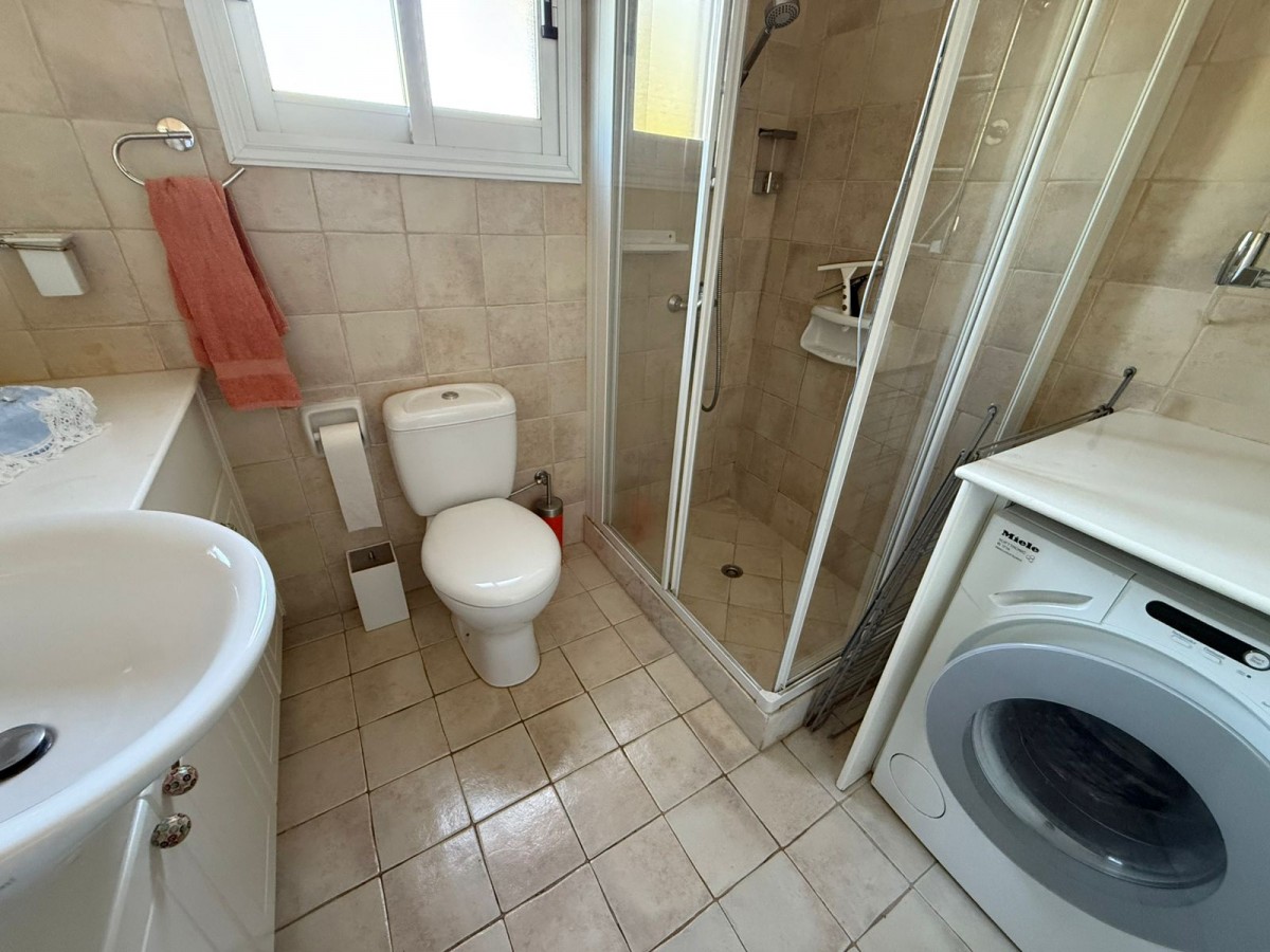 Living room with integrated kitchen separated by bar counter, 3 double bedrooms with ceiling fans, 1 bathrooms, 1 shower, new air conditioning, double glazing, external shutters, communal parking and large, communal swimming pool, fully furnished and equipped, and also has a spacious and furnished terrace.