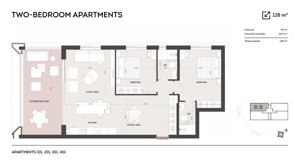 For sale 2 bedroom apartment: Interior comprises of an open plan living with direct access to the covered balcony, dining and kitchen area,one double bedroom with direct access to covered veranda, one single bedroom and two bathrooms.