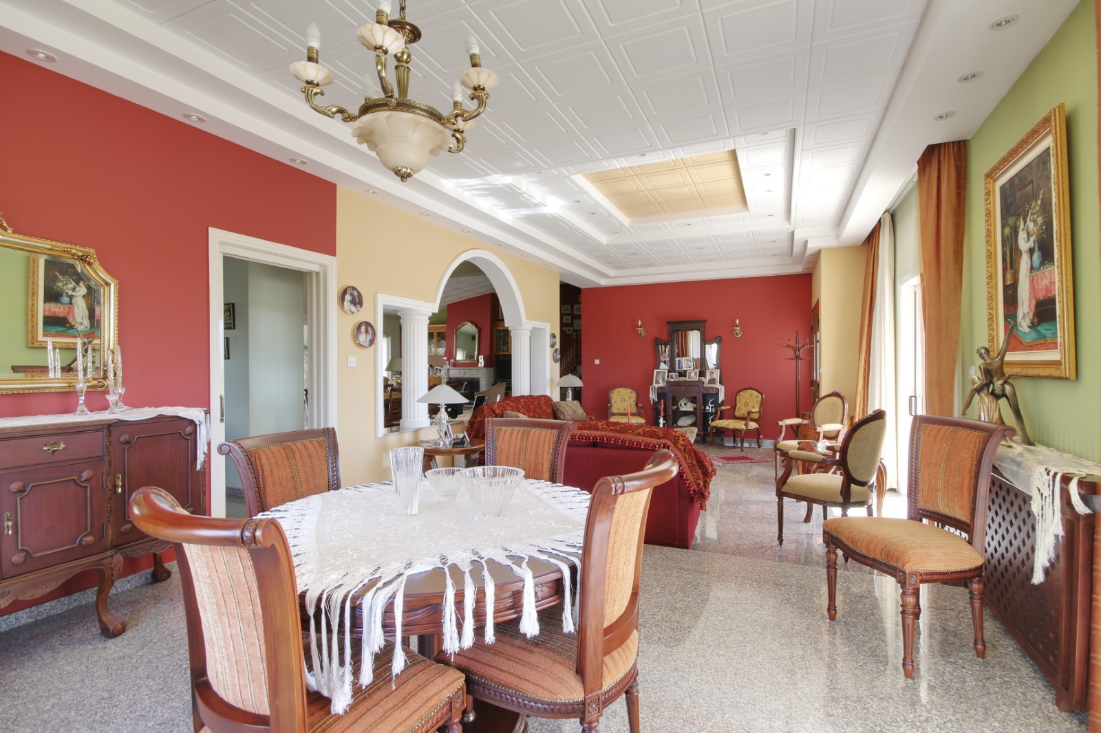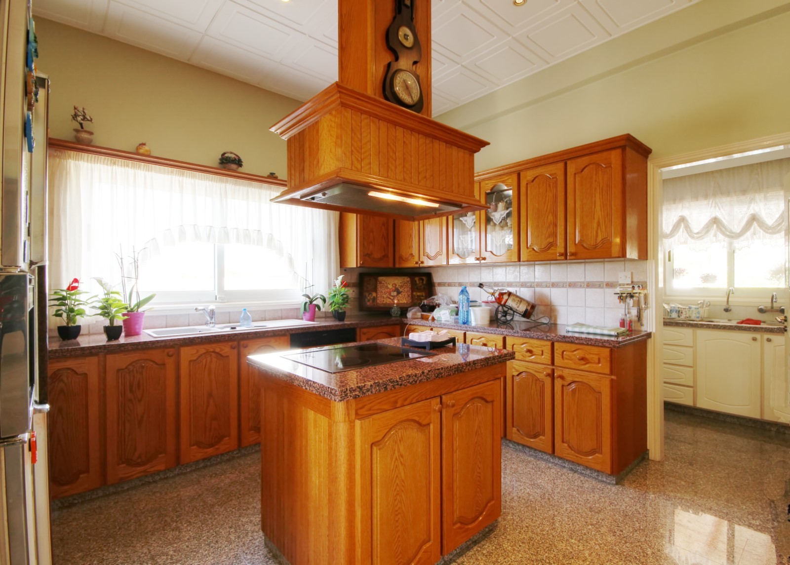 One enters through the front door into the formal sitting room beyond which is the dining area. Both rooms have French windows looking out over the front lawns. Beyond the sitting room is the breakfast room and the family sitting room with its large fireplace and views out over the back of the property to the fruit trees. The kitchen was custom built for the property and boasts all the usual mod-cons and a centre island. There is a pantry off the kitchen with ample storage room a double sink and plenty of worktop.