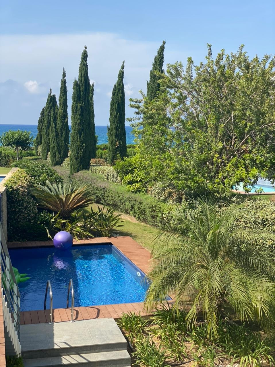 The house is approached up a short staircase from the private parking place, equipped with electric roller doors, and through the beautifully laid out gardens with mature trees and flowering shrubs. Downstairs is a large and airy sitting area, two double bedrooms with two bathrooms and a storage room. The first floor offers beautiful and spacious living area, kitchen is partially screened from the living room and with its granite work tops and built in appliances has a modern and trendy look and feel and there is plenty of space for a dining table as well. There are 3 double bedrooms as well with fitted wardrobes and en suite shower or bathrooms. Lift or Stairs will lead you to the second floor, where you will find one extra size master bedroom with Jacuzzi facilities and patio doors leading to a large veranda with amazing sea views.