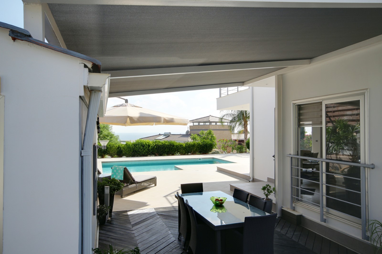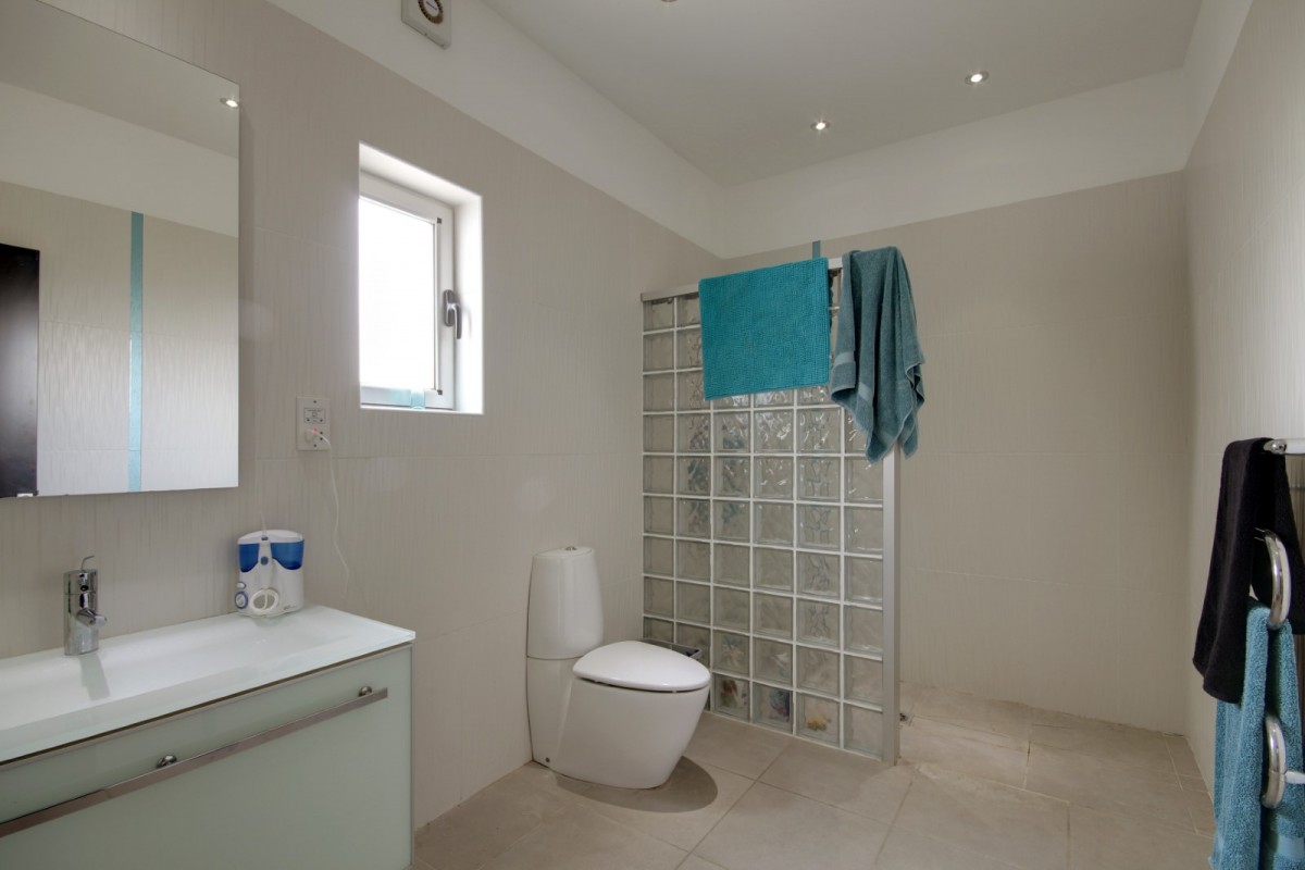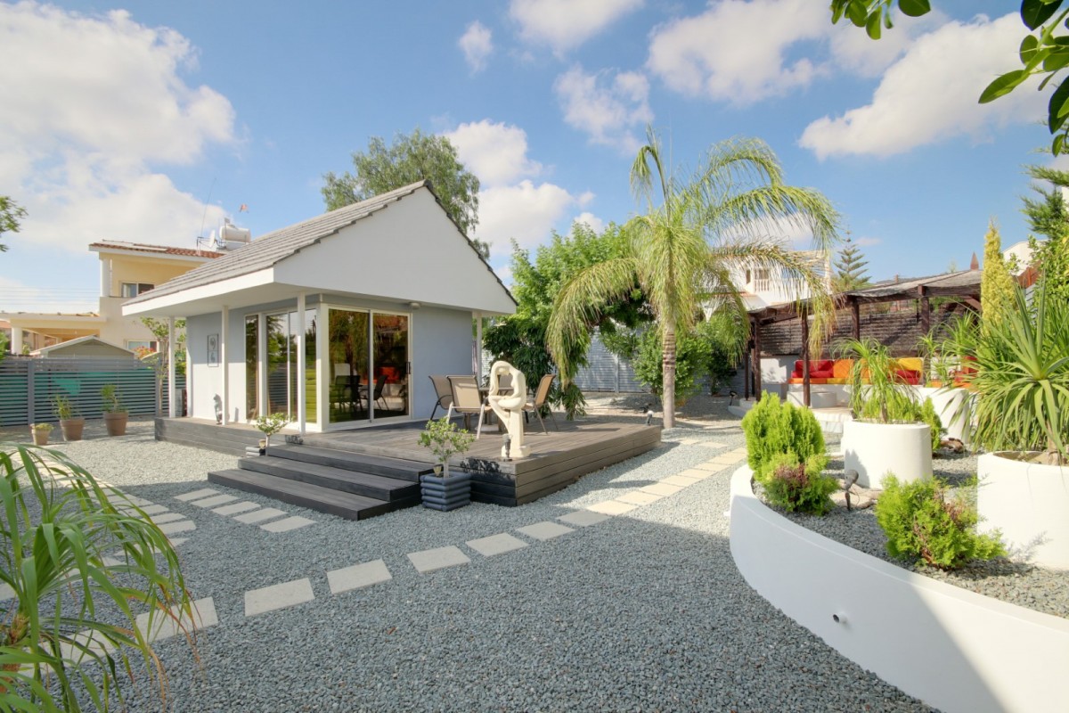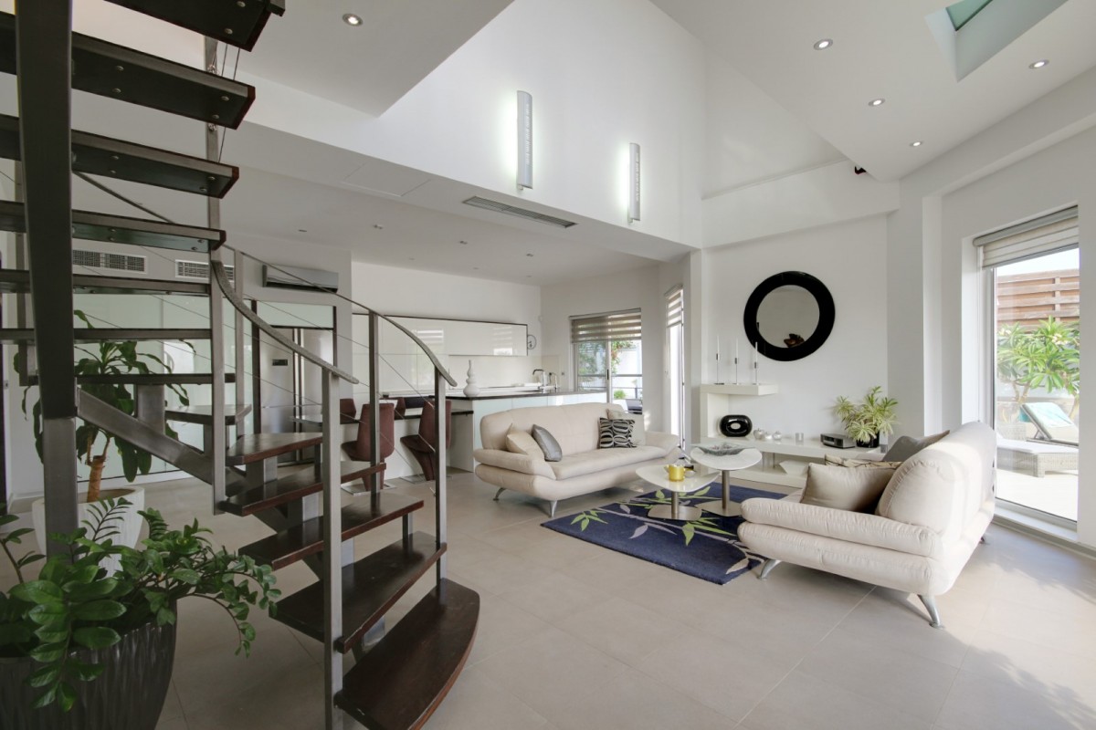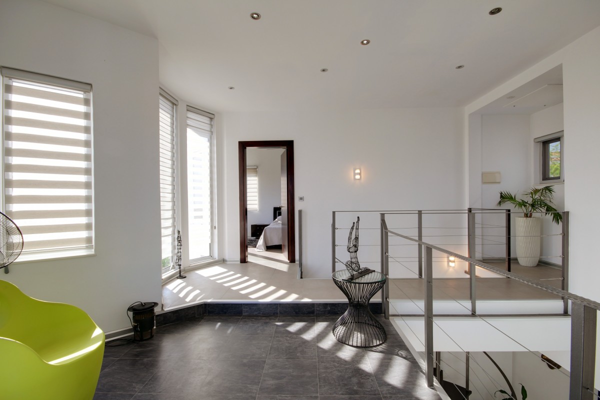 This bespoke architect designed house offers three bedrooms and three bathrooms, a stunningly attractive and spacious designer kitchen with an impressive central island.. Upstairs there is a mezzanine landing with master bedroom positioned at the rear also a guest bedroom at the front of the property. The rear of the property boasts an additional temporary structure which is currently used as an office but has the potential to become a guest suite with bathroom. The ‘entertainment’ area boasts a separate utility room and shower facility and a lovely swimming pool, and all the extensive patios surrounding the house and pool are lined with non -slip tiles. One enters via a private driveway at the end of a quiet cul-de-sac so no traffic noises to disturb ones enjoyment of this property. Now will it be love at first sight????