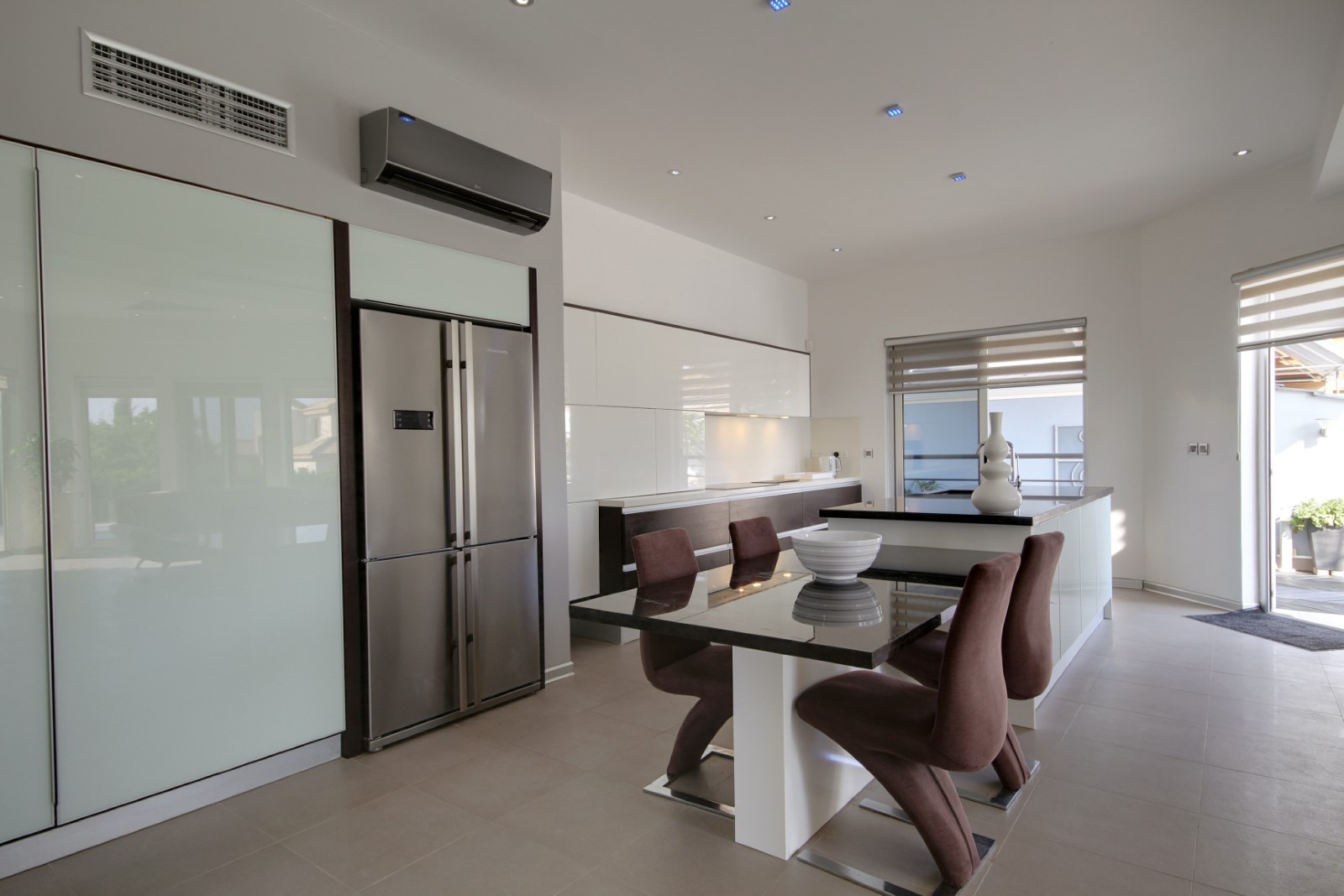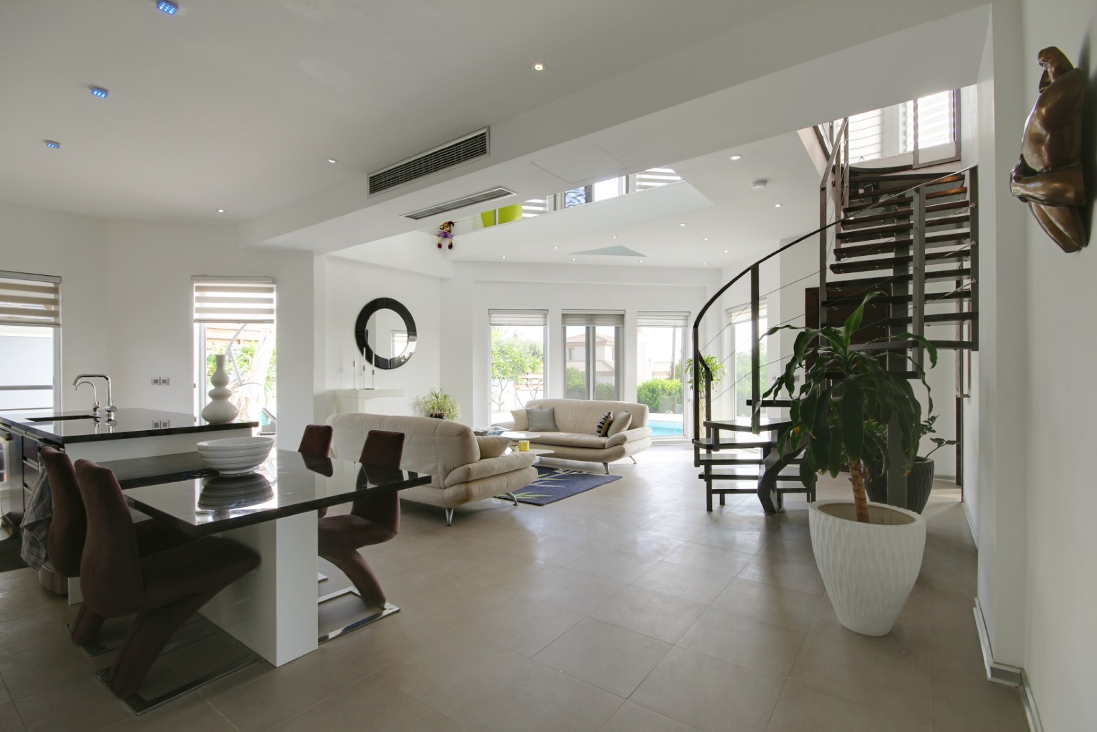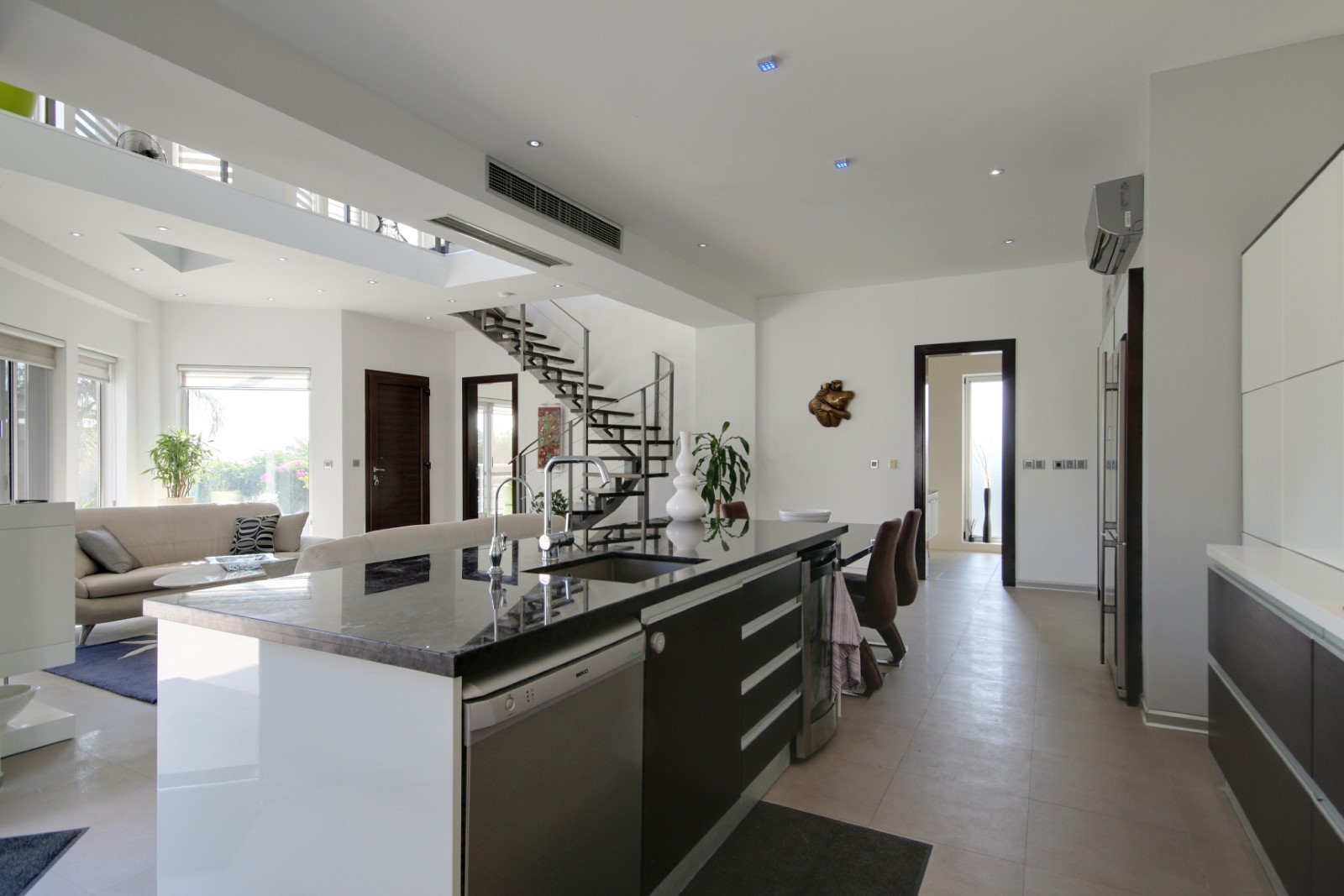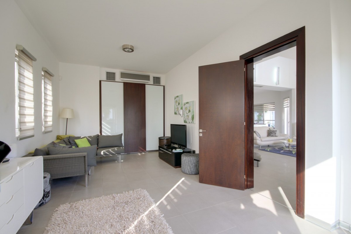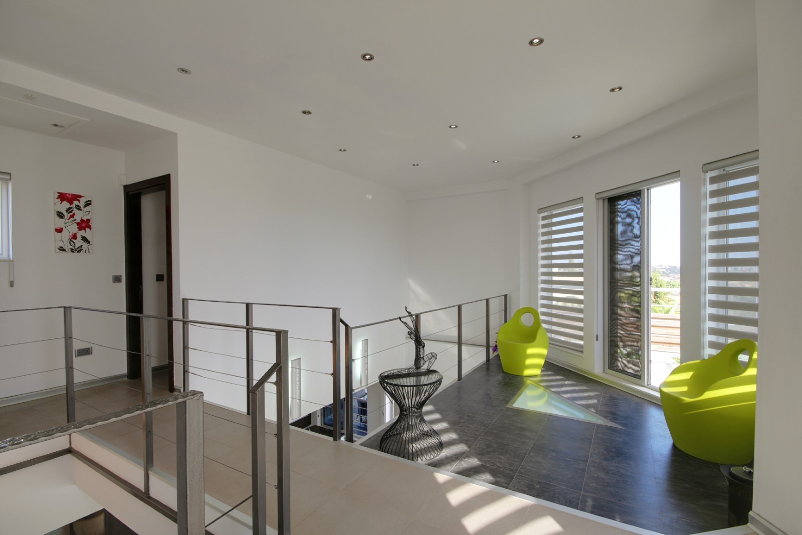 This bespoke architect designed house offers three bedrooms and three bathrooms, a stunningly attractive and spacious designer kitchen with an impressive central island.. Upstairs there is a mezzanine landing with master bedroom positioned at the rear also a guest bedroom at the front of the property. The rear of the property boasts an additional temporary structure which is currently used as an office but has the potential to become a guest suite with bathroom. The ‘entertainment’ area boasts a separate utility room and shower facility and a lovely swimming pool, and all the extensive patios surrounding the house and pool are lined with non -slip tiles. One enters via a private driveway at the end of a quiet cul-de-sac so no traffic noises to disturb ones enjoyment of this property. Now will it be love at first sight????