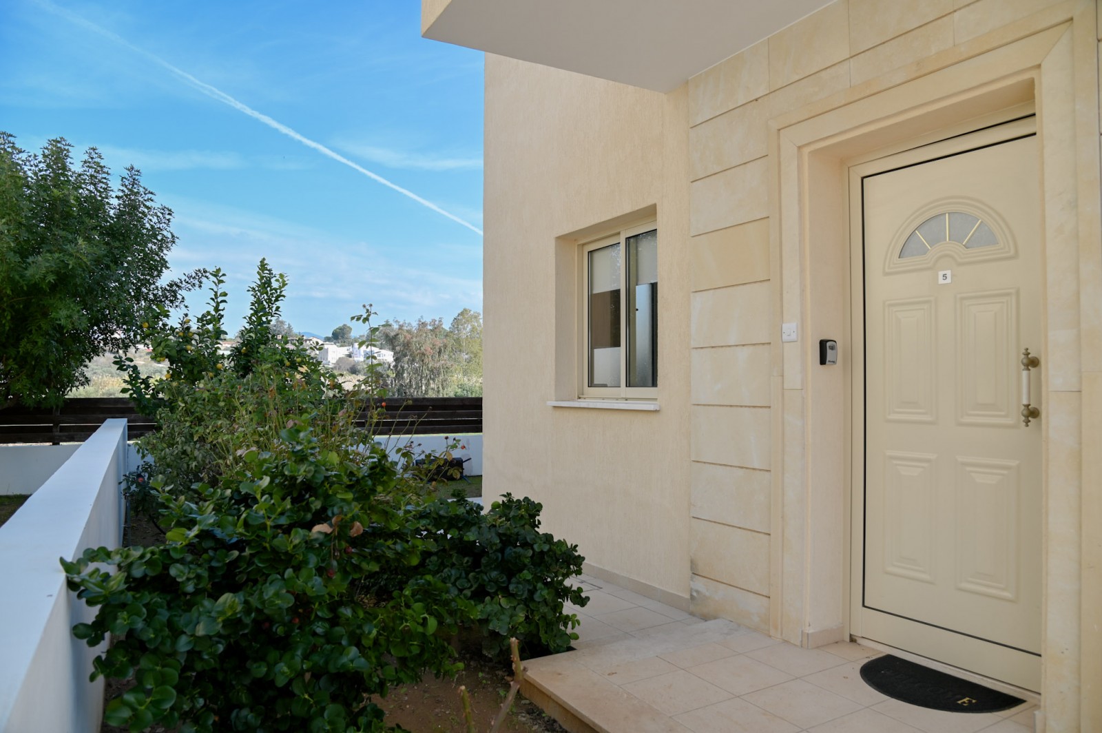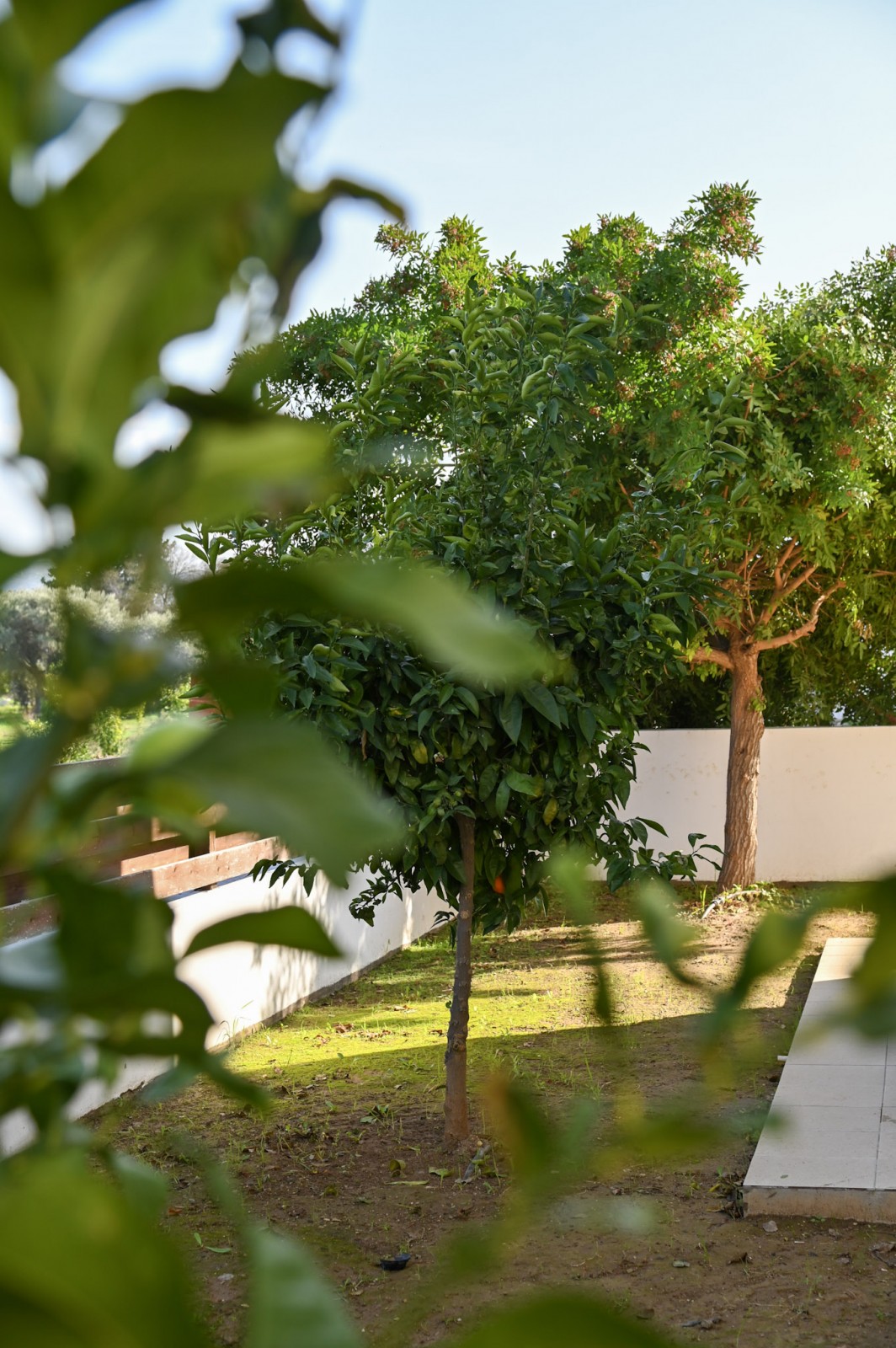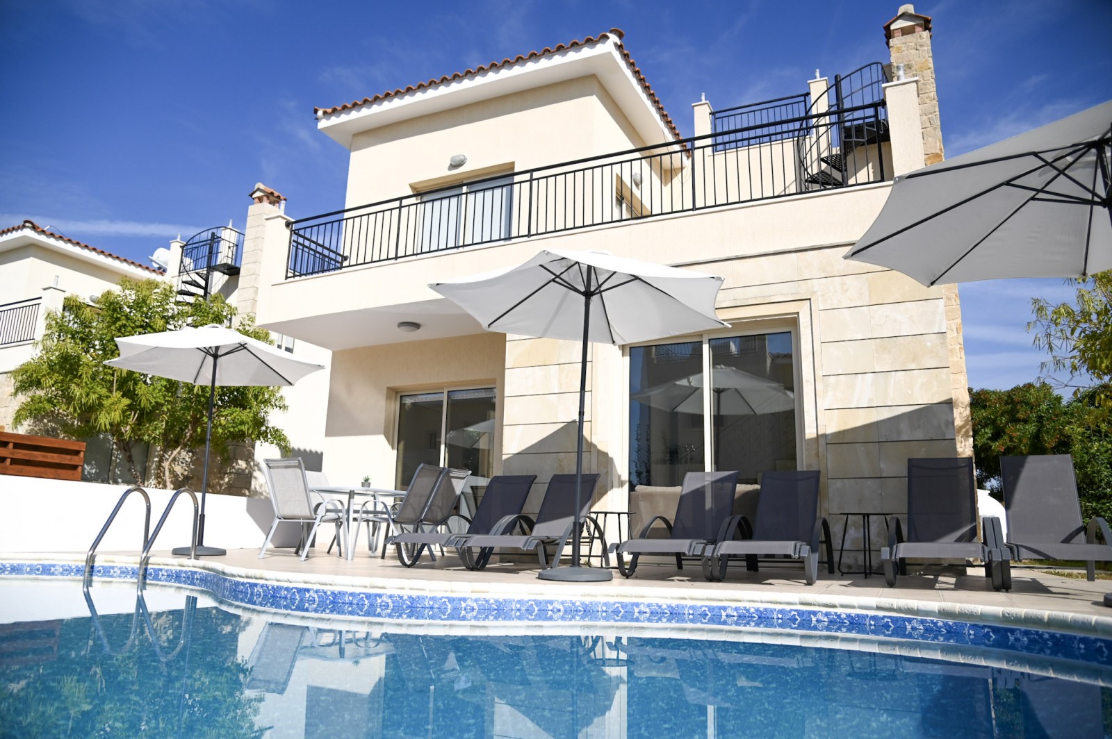 Upstairs, the property includes three good-sized bedrooms, with the master bedroom enjoying access to a balcony. Outside, the villa benefits from a landscaped garden with fruit trees and a roof terrace offering lovely views.