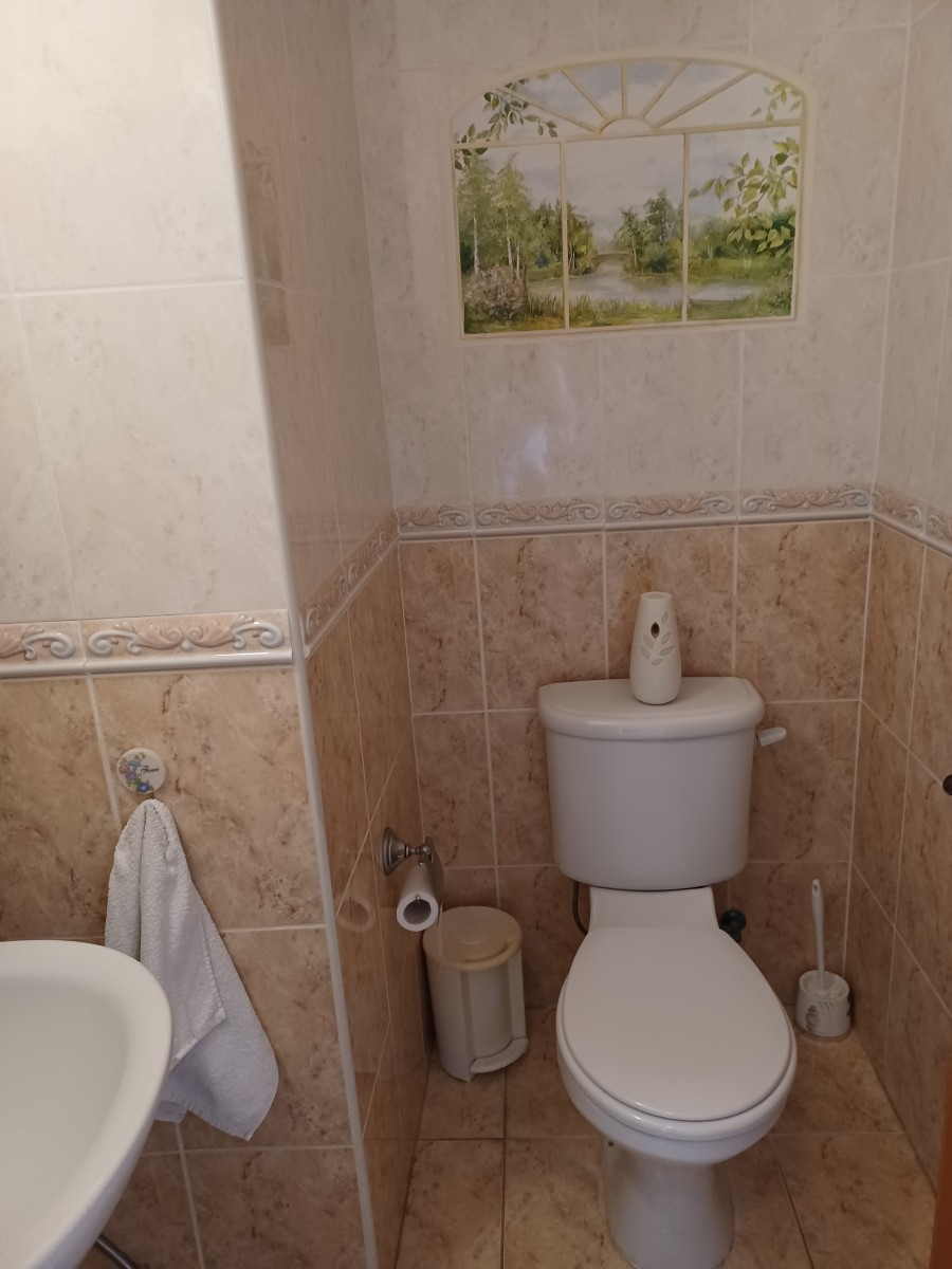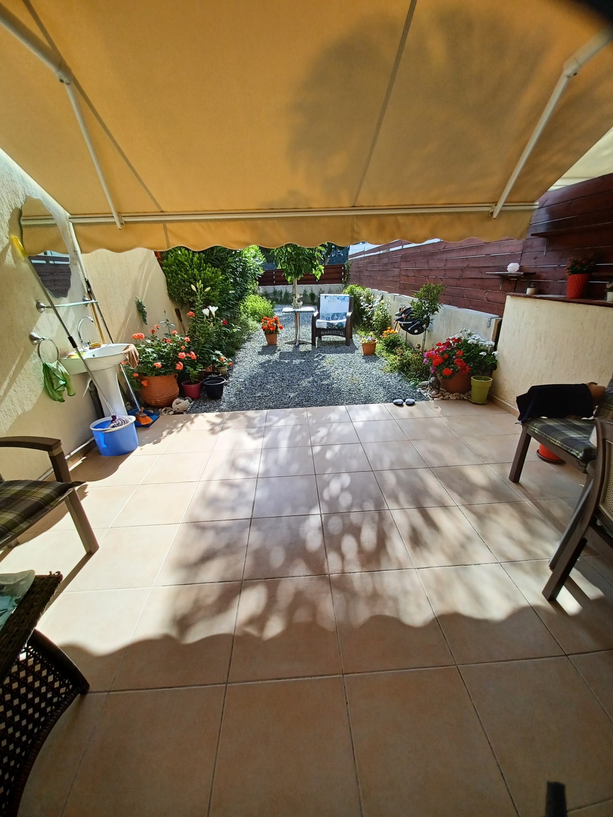 From the main entrance a long corridor will lead you to separate fully fitted and equipped kitchen, a guest w/c and an open plan dining and living area with patio doors leading to a nice well maintained private garden area. Stairs will lead you to the upper floor, where you will find two double bedrooms with fitted wardrobes and a family bathroom. Both bedrooms are with direct access to verandas.