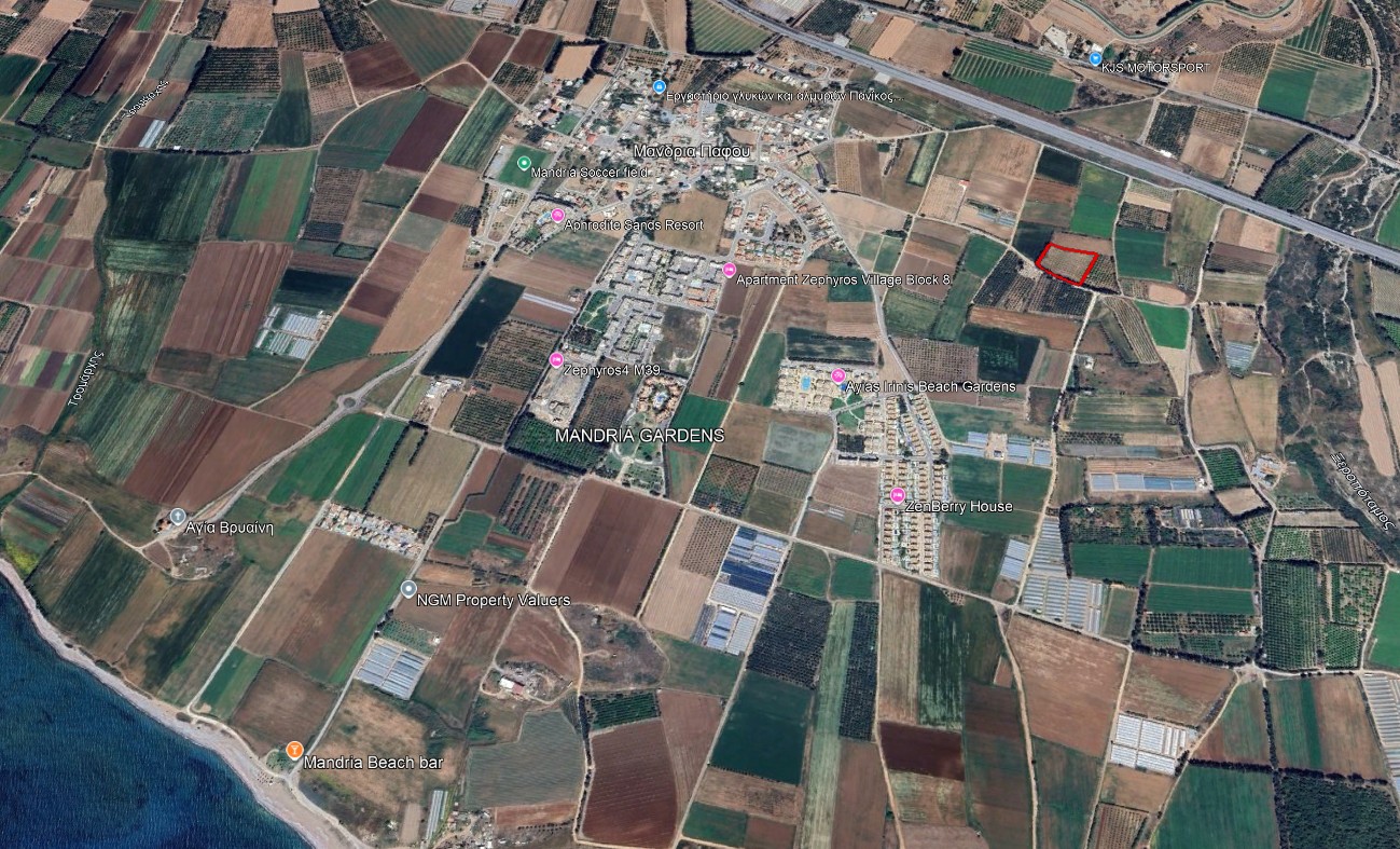 Conveniently, it is about 5 km from the airport and 1.5 km from the sea. The land also offers easy access to the Paphos-Limassol motorway, along with nearby amenities and facilities. Additionally, Paphos town is just a 15-minute drive from Mandria village.